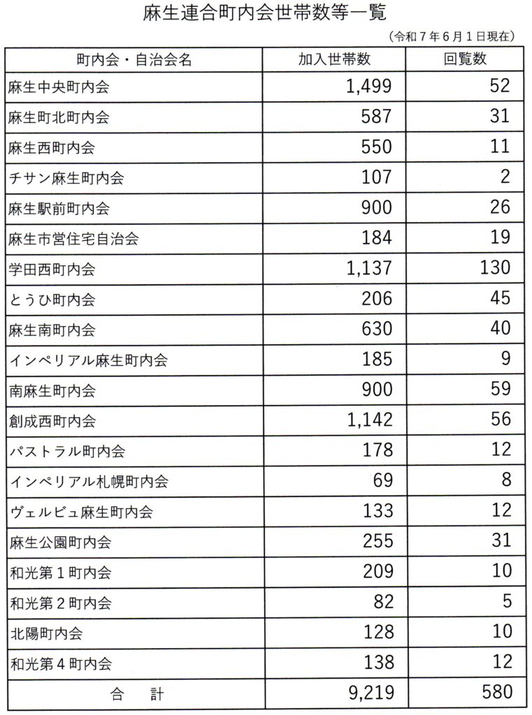 麻生連合町内会 2020.12.202025.11.07 麻生連合町内会は、麻生地区を構成する16の単位町内会から成り立っています。 ➡麻生連合町内会のMAPはこちらに ➡各町内会の地域区分はこちらに ➡麻生連合町内会世帯数・回覧数