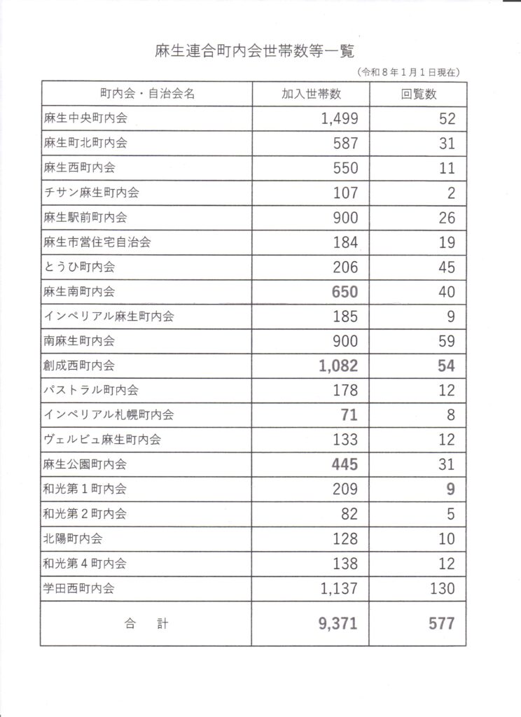 麻生連合町内会 2020.12.202026.01.09 麻生連合町内会は、麻生地区を構成する16の単位町内会から成り立っています。 ➡麻生連合町内会のMAPはこちらに ➡各町内会の地域区分はこちらに ➡麻生連合町内会世帯数・回覧数